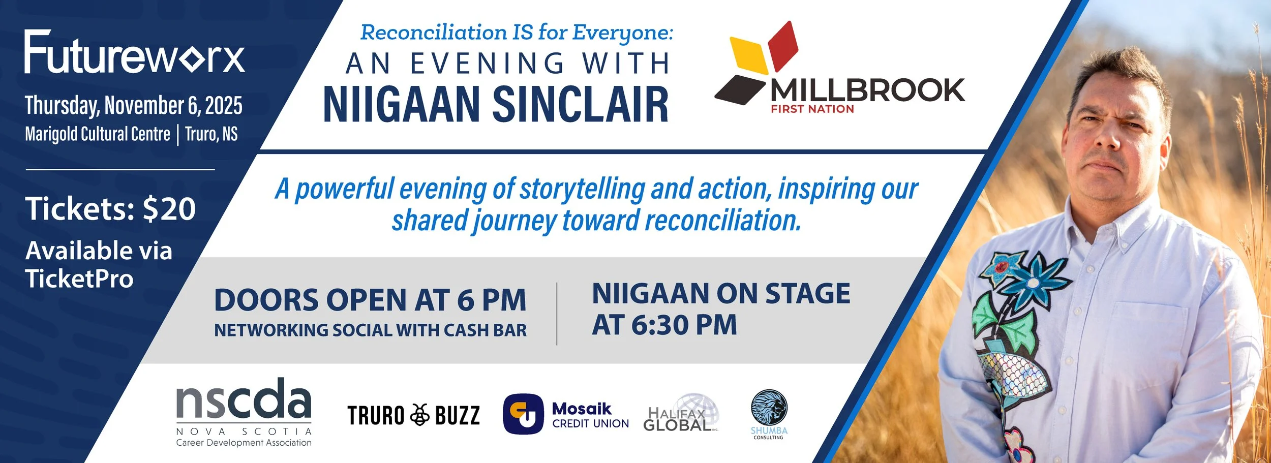 Through compelling storytelling and practical insights, Niigaan Sinclair will challenge us to see reconciliation not as a distant idea, but as a personal and collective responsibility. This event will bring together community leaders, businesses, and residents to foster meaningful dialogue and shared understanding, while raising support for Futureworx’s mission of building skilled, inclusive, and resilient communities across Nova Scotia.
